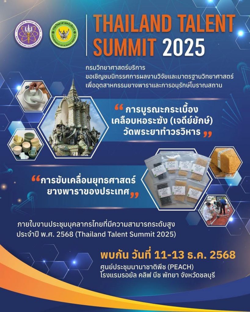 กรมวิทยาศาสตร์บริการ (วศ.) กระทรวงการอุดมศึกษา วิทยาศาสตร์ วิจัยและนวัตกรรม (อว.) ขอเชิญชวนประชาชนและผู้สนใจเข้าร่วมงานประชุมบุคลากรไทยที่มีความสามารถระดับสูง ประจำปี 2568 (Thailand Talent Summit 2025) ระหว่างวันที่ 11–13 ธันวาคม 2568 ณ ศูนย์ประชุมนานาชาติพีช (PEACH) โรงแรมรอยัล คลิฟ บีช พัทยา จังหวัดชลบุรี