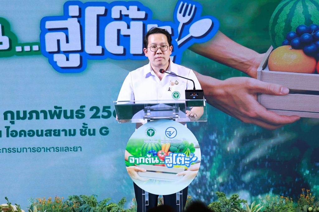 นายพัฒนา พร้อมพัฒน์ รัฐมนตรีว่าการกระทรวงสาธารณสุข เป็นประธานเปิดงาน “จากต้น…สู่โต๊ะ” ณ เมืองสุขสยาม ห้างสรรพสินค้าไอคอนสยาม ชั้น G โดยกล่าวว่า กระทรวงสาธารณสุขให้ความสำคัญกับการดูแลคุณภาพชีวิตของประชาชน ผ่านการส่งเสริมการบริโภคผักและผลไม้อย่างปลอดภัย การจัดงานในครั้งนี้นับเป็นเวทีสำคัญในการยกระดับความปลอดภัยของผักและผลไม้ตลอดห่วงโซ่อุปทาน ตั้งแต่แหล่งผลิต การนำเข้า การกระจายสินค้า ไปจนถึงมือผู้บริโภค เพื่อสร้างความเชื่อมั่นให้กับประชาชน
